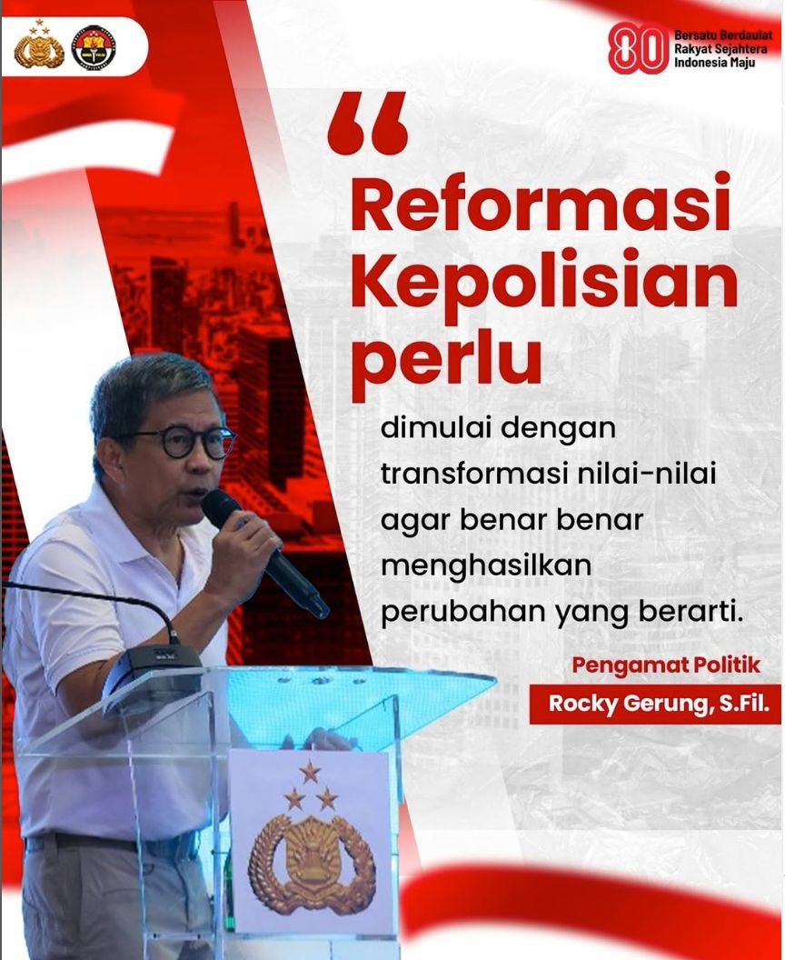Jakarta — Pengamat politik Rocky Gerung, S.Fil., menegaskan bahwa reformasi kepolisian tidak bisa hanya berhenti pada perubahan struktural atau prosedural. Menurutnya, inti dari reformasi sejati terletak pada transformasi nilai yang dipegang oleh institusi kepolisian.
